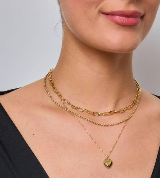 Conjunto de Joyas Collar Triple Corazón en Acero Chapado en Oro 18K